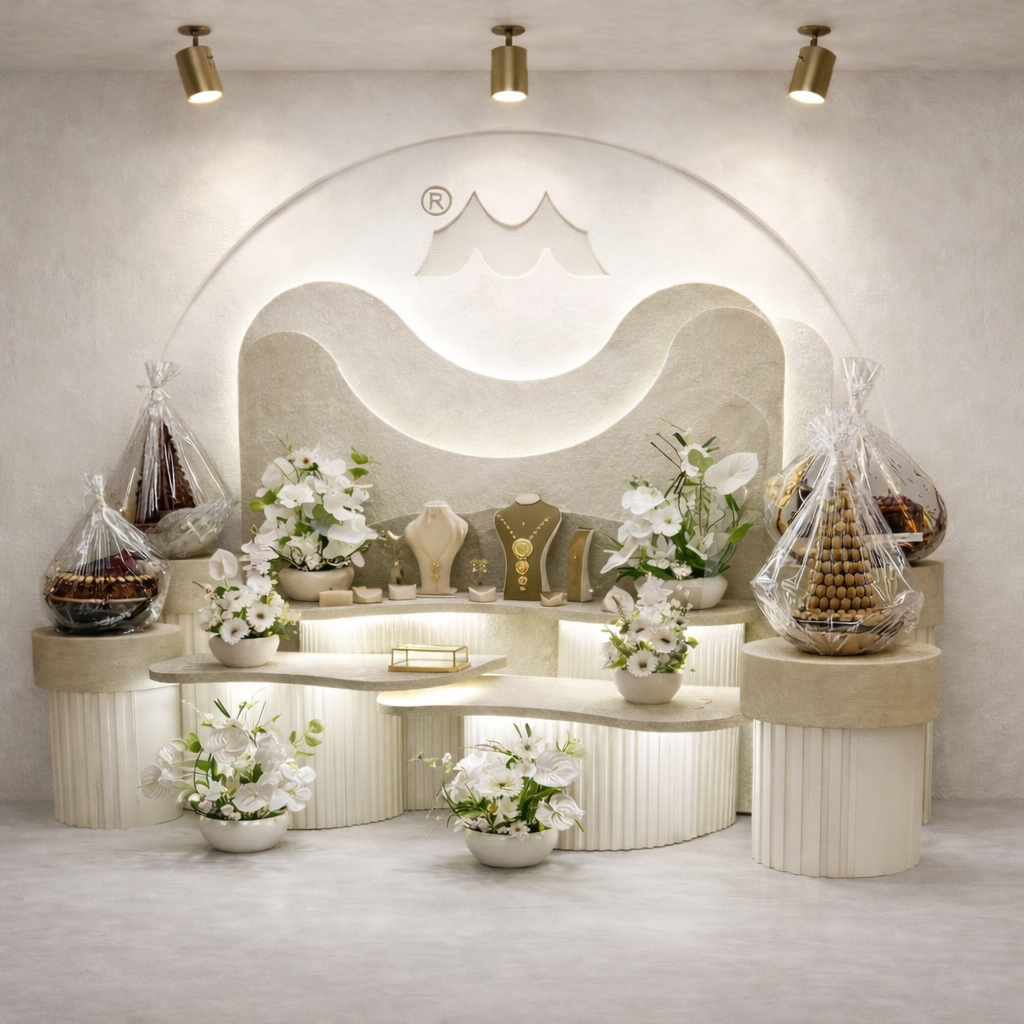 استقبال مناسبات بتصميم ثابت وأنيق، يعتمد على خطوط عصرية وإضاءة ناعمة تعطي حضور فخم بدون مبالغة، مناسب للاستخدام داخل المنازل أو في مداخل المناسبات الصغيرة والمتوسطة.