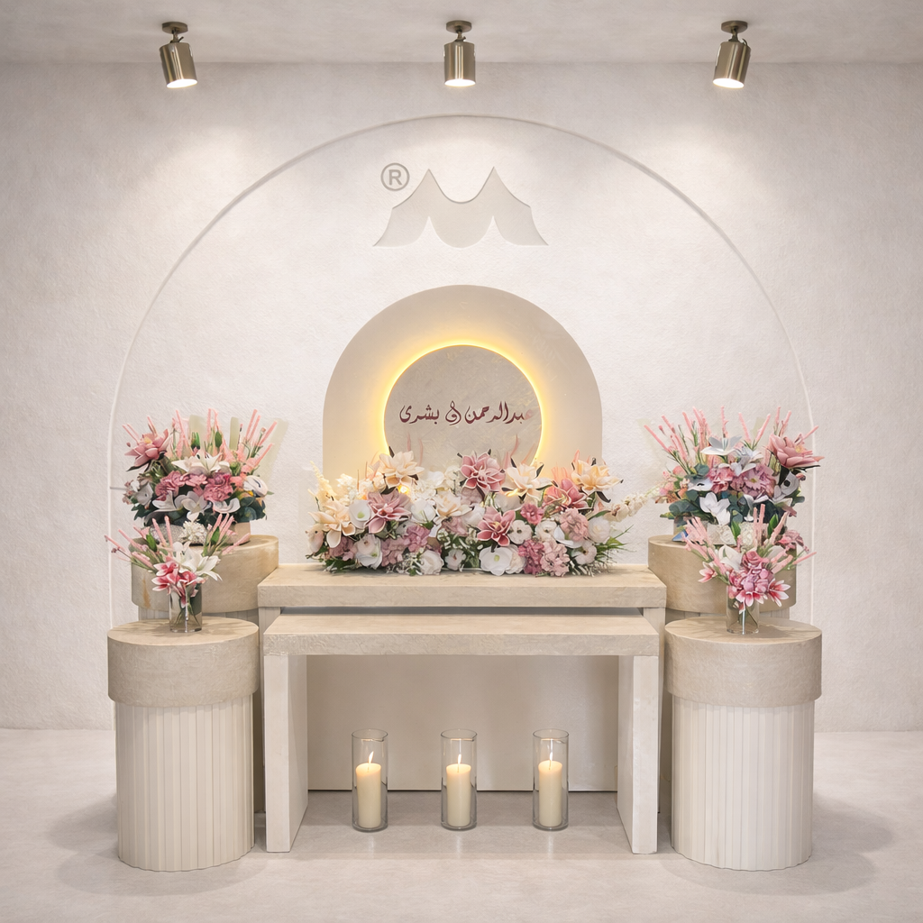 استقبال مناسبات بتصميم ثابت وأنيق، يعتمد على لوحات خلفية دائرية بإضاءة ناعمة مع طاولة استقبال متناسقة وتنسيق ورد ناعم بألوان هادئة، يعطي إحساس راقٍ ومتوازن يناسب مختلف المناسبات.