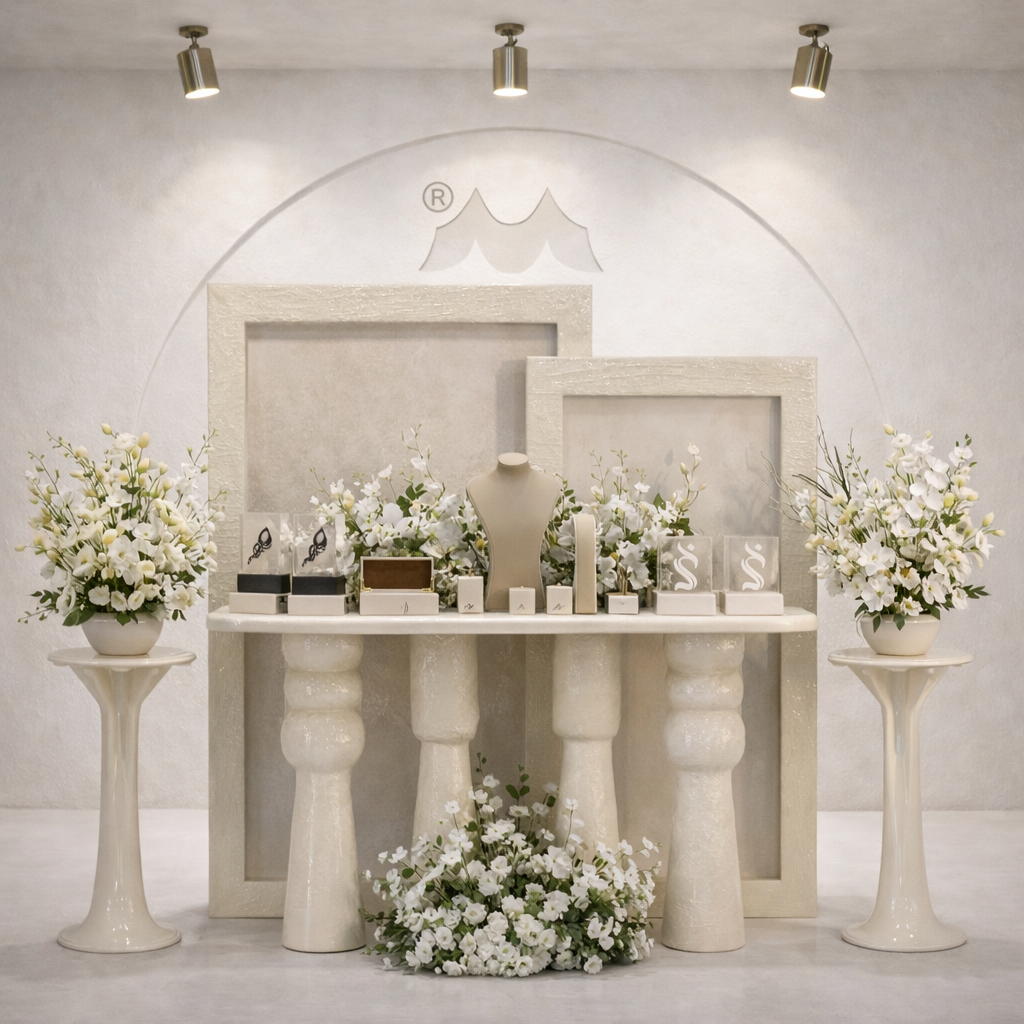 استقبال مناسبات بتصميم ثابت وأنيق، يعتمد على لوحتين خلفيتين مربعتين بطبقات بارزة بلون عاجي محايد، مع طاولة استقبال مستقيمة مدعومة بقواعد أسطوانية بتصميم كلاسيكي، تعطي إحساس متوازن وواضح في التكوين.