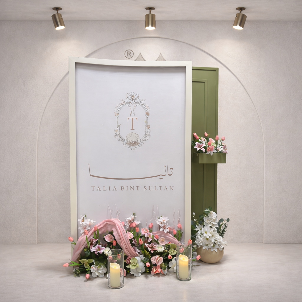 استقبال مناسبات بتصميم ثابت وأنيق يعتمد على لوحة خلفية رئيسية مستطيلة بلون فاتح مع إطار بسيط يتوسطه اسم وشعار مناسب للمناسبة، ويظهر خلفها لوحة جانبية بلون أخضر زيتوني تعطي عمق بصري وتباين ناعم في التكوين.