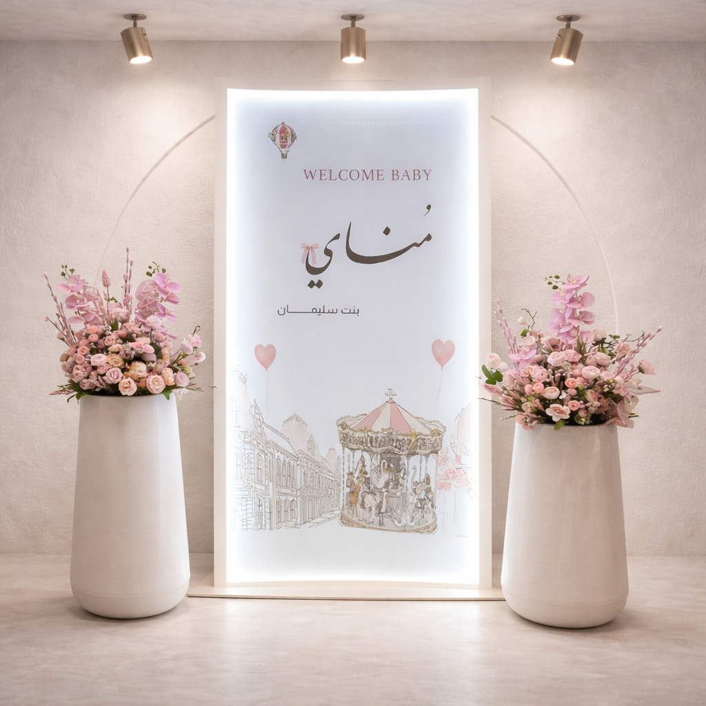 استقبال مواليد بتصميم منزلي يعتمد على لوحة خلفية مستطيلة مضيئة بالكامل بإطار أبيض ناعم، تتوسطها عبارة ترحيبية بالمولود مع الاسم مكتوب بأسلوب أنيق، ويظهر أسفل اللوحة رسم توضيحي ناعم يضيف طابع طفولي هادئ للتصميم.