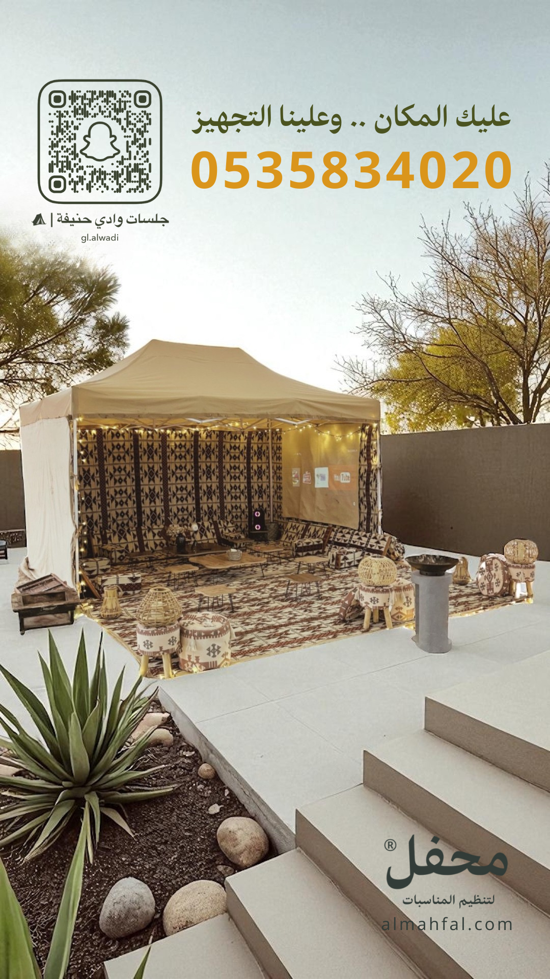 خيمة أرضية فاخرة من محفل®، مجهزة بكامل تفاصيل الراحة والتنسيق لتناسب الجلسات العائلية والمناسبات الخاصة في أجواء خارجية أنيقة.