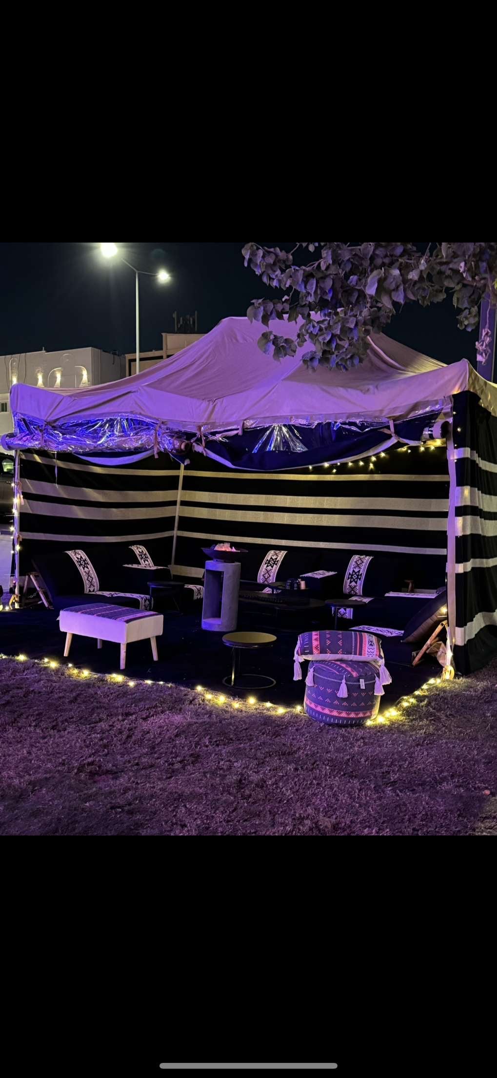 خيمة أرضية فاخرة من محفل®، مجهزة بكامل تفاصيل الراحة والتنسيق لتناسب الجلسات العائلية والمناسبات الخاصة في أجواء خارجية أنيقة.