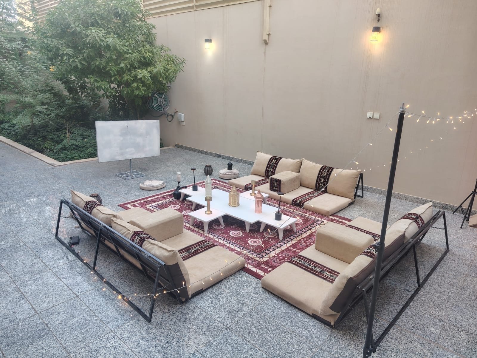 جلسة أرضية فاخرة من محفل®، مجهزة بكامل تفاصيل الراحة والتنسيق لتناسب الجلسات العائلية والمناسبات الخاصة في أجواء خارجية أنيقة.