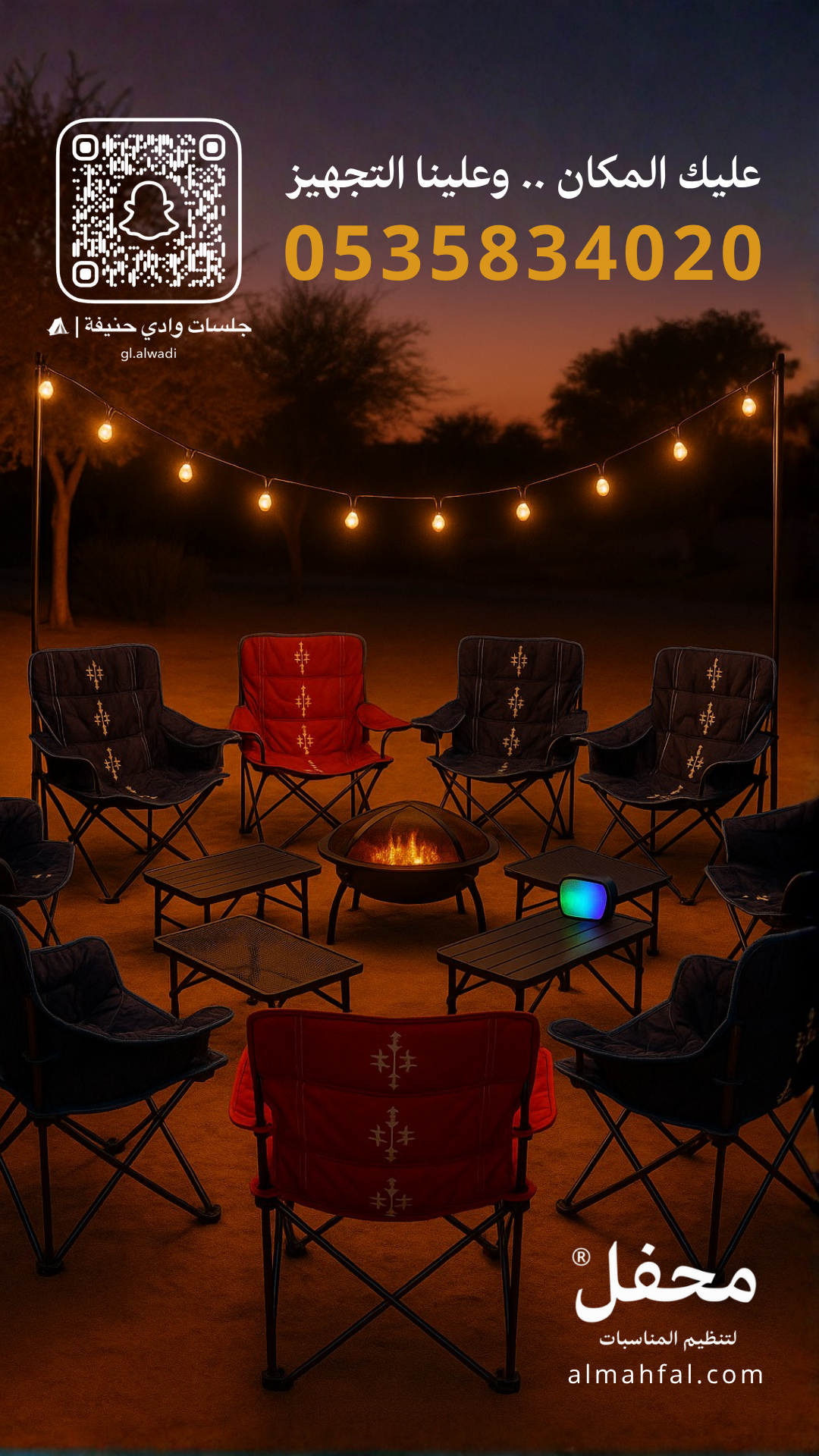 • الموقع: يتم تجهيز الجلسة في وادي حنيفة بإطلالة طبيعية جميلة.